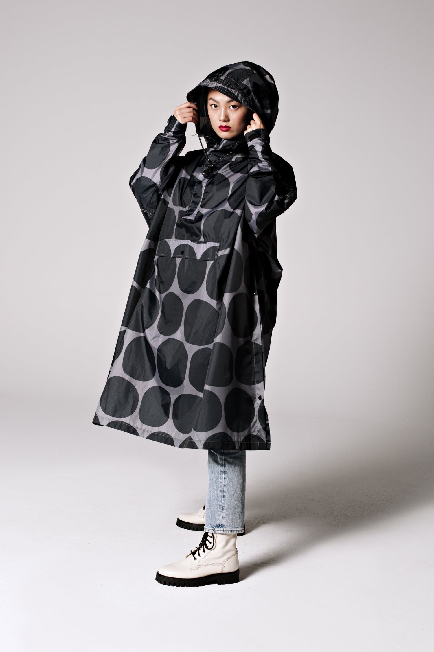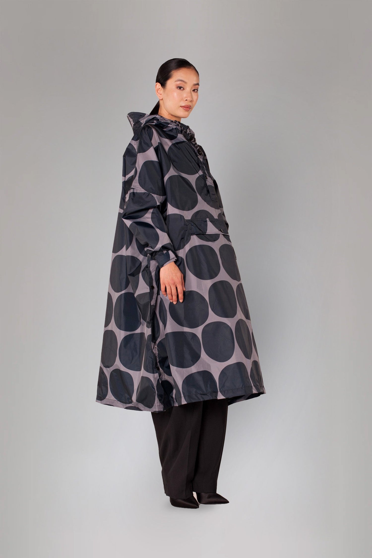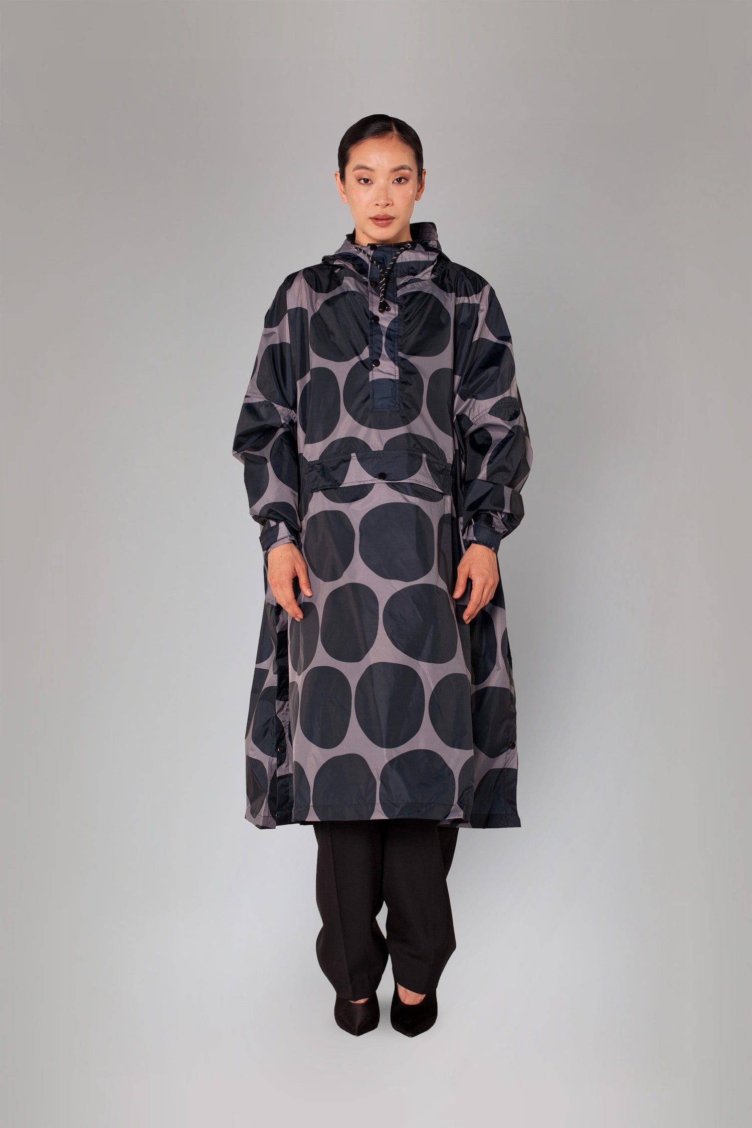 The world famous polka dot print gets a fresh new look with the Black Polka rain poncho. Combining this playful print with dark tones of black and grey, the Black Polka keeps you dry and looking great. Make every rainy day Polka mania with Black Polka.